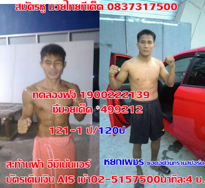 สมัครมวยไทยทีเด็ด 083-7317500 ทดลองฟัง 1900-222-139 ชี้มวยเด็ด*499212 หรือเติมบัตรเงินสด ais เข้าเบอร์ 02-5157500นาทีละ4บาท