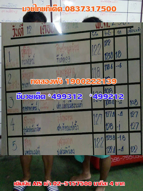 ชี้มวยเด็ด ชี้ตัวให้เล่น ทดลองฟัง ชี้มวยเด็ด โทร 1900 222 139 * 499312 *499212 กด 1 วิเคราะห์มวยเด็ด เรตมวย คู่มวยการชั่งน้ำหนัก กด 2 พากษ์สดติดขอบเวที พากษ์ วันศุกร์ช่องทรู 24 เวทีรังสิต วันเสาร์ ช่อง 3 ไทยรัฐ ช่อง9 ช่อง 26 วันอาทิตย์ ช่อง 7 ช่อง 11 ช่อง 5 ช่อง now26 **เน้นมวยมาสู้ รู้วงใน เล่นมวยแพ้ ให้ได้ตางค์**เพียงเดือนละ 1,300 บาท**สมัคสมาชิกโทร 083-7317500